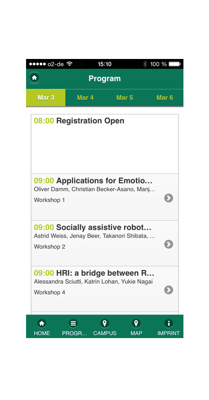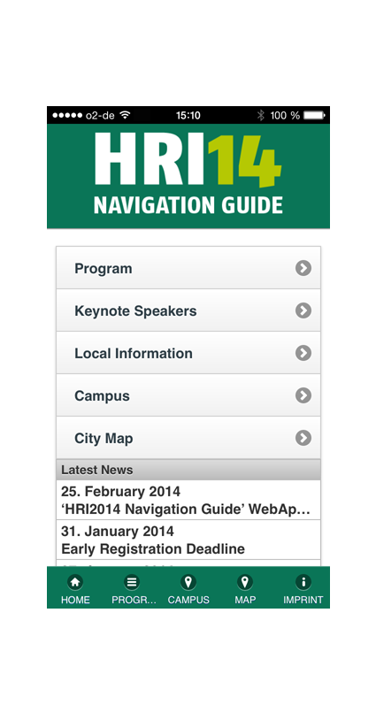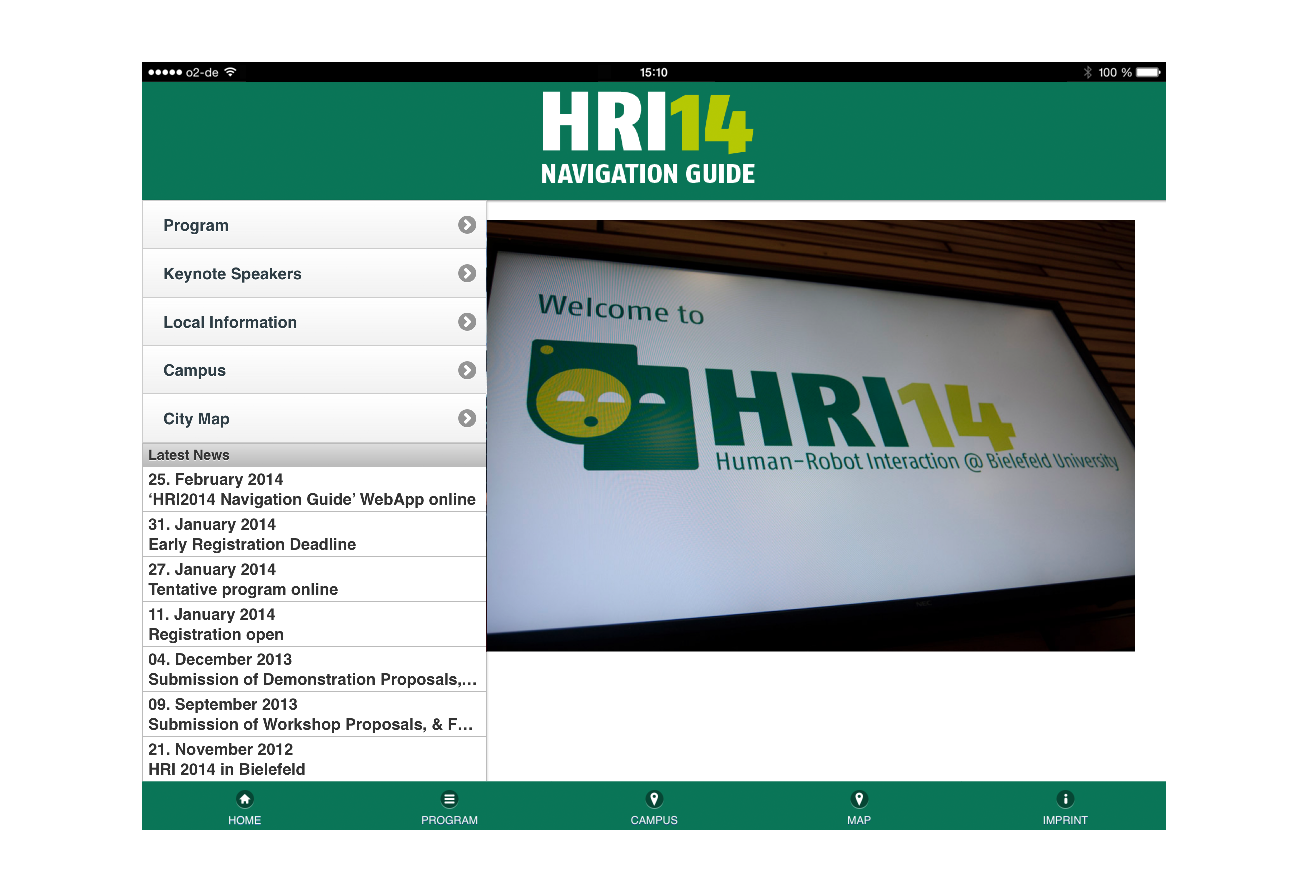 Im Zuge der Umsetzung der Seite für die Human Robot Interaction 2014 schlug ich dem verantwortlichen Designer aus dem Organisatonsteam eine Web App vor, mit der die Besucher der Veranstaltung wichtige Informationen, wie das aktuelle Programm, Informationen über einzelne Workshops oder einen Plan vom Gelände gesammelt in einer Anwendung finden. Aus dieser Idee entstand dieses Nebenprojekt.