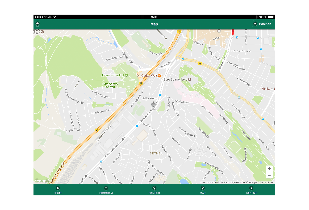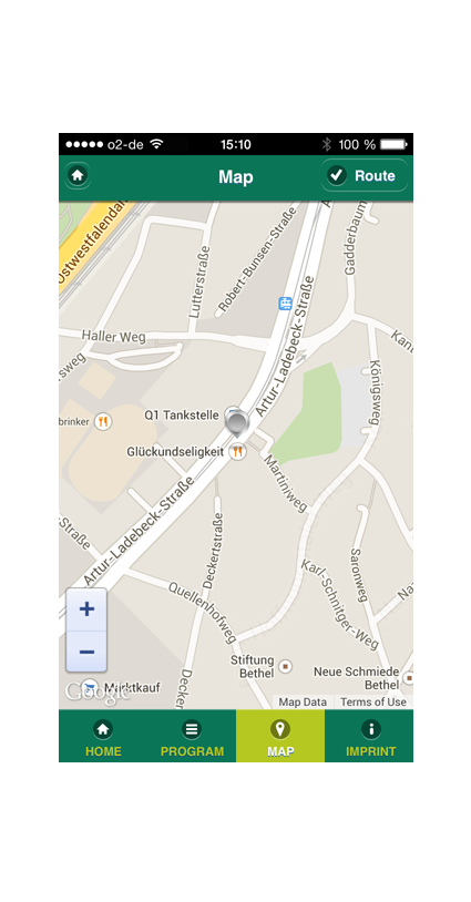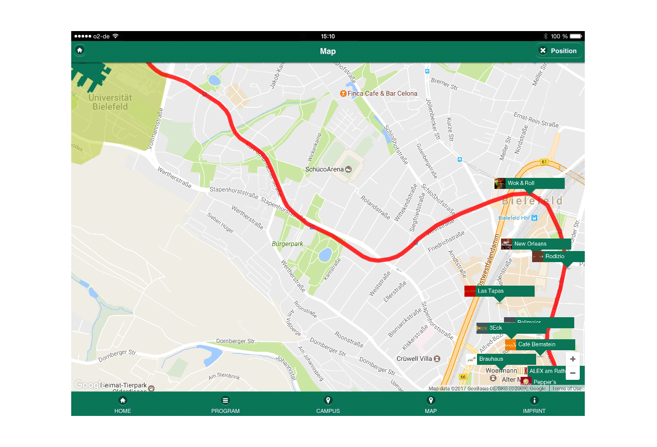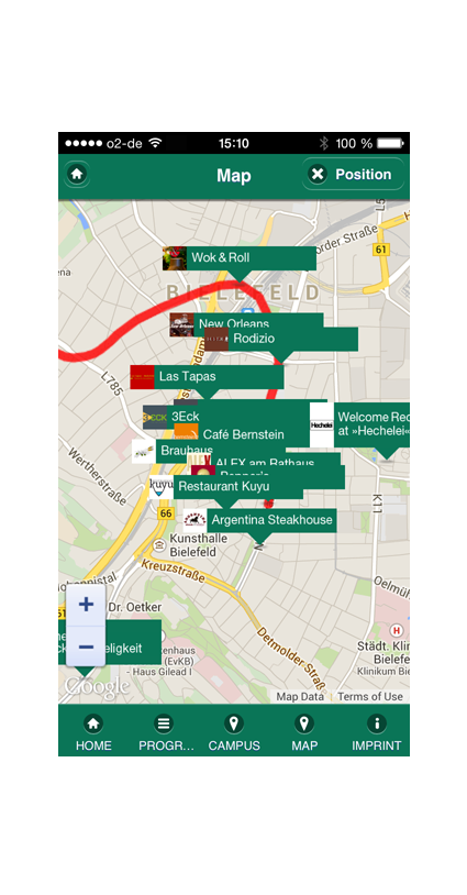 Auf einer per Google Maps implementierten Karte sind Restaurants, die wichtigste Straßenbahnlinie, sowie Orte für das Abendprogramm verzeichnet. Die in der App angezeigten Restaurants wurden der HRI2014-Hauptseite entnommen, deren Adressen der entsprechenden Orte in Geo-Koordinaten umgewandelt, in einer Datenbank gespeichert und via JSON zur Verfügung gestellt. Durch das Caching der meisten Daten, mussten so ausschließlich Daten von Google Maps geladen werden.