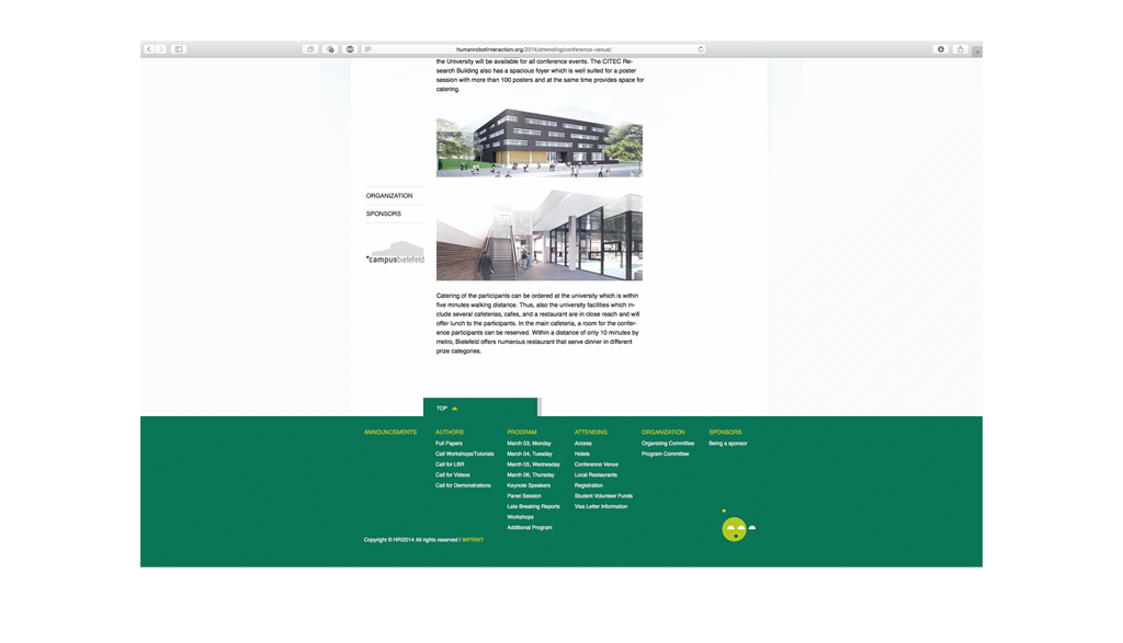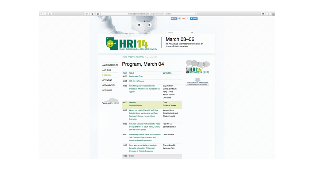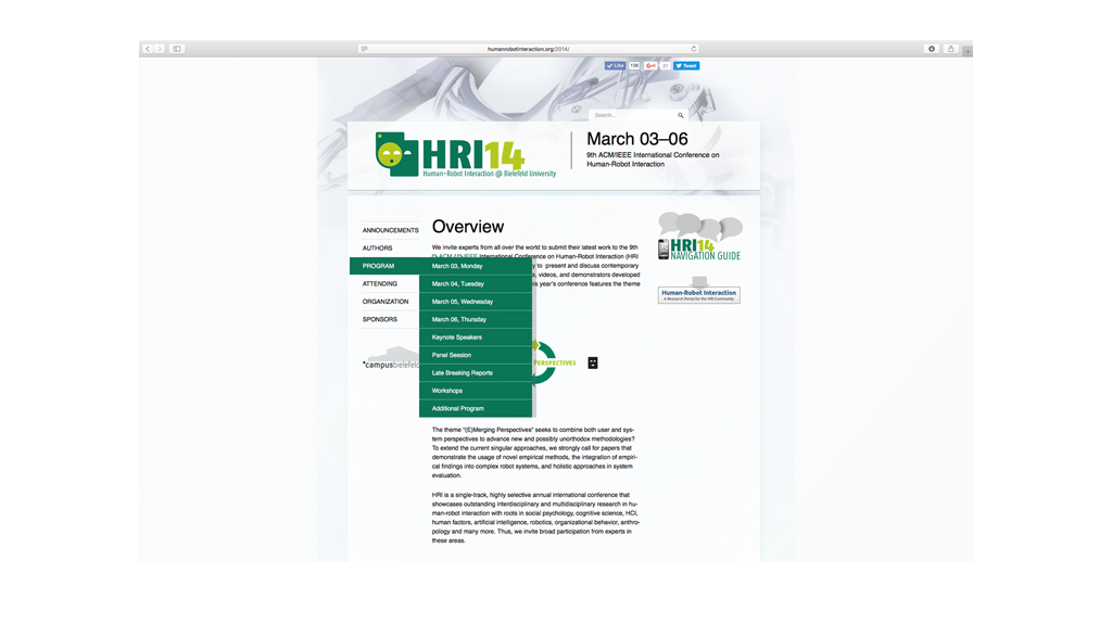 Bei der ACM/IEEE International Conference on Human-Robot Interaction (kurz HRI) handelt es sich um eine der weltweit größten Konferenzen rund um den Bereich Human-Robot Interaction, der Themengebiete wie künstliche Intelligenz, Mensch-Maschine-Interaktion und Robotik einschließt. Im Jahr 2014 fand die Veranstaltung im CITEC der Universität Bielefeld statt und ich durfte für dieses Event die Website umsetzen.